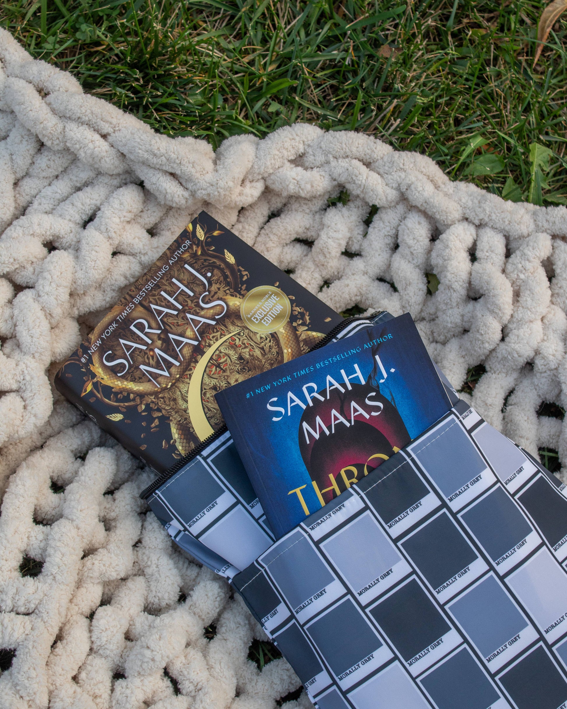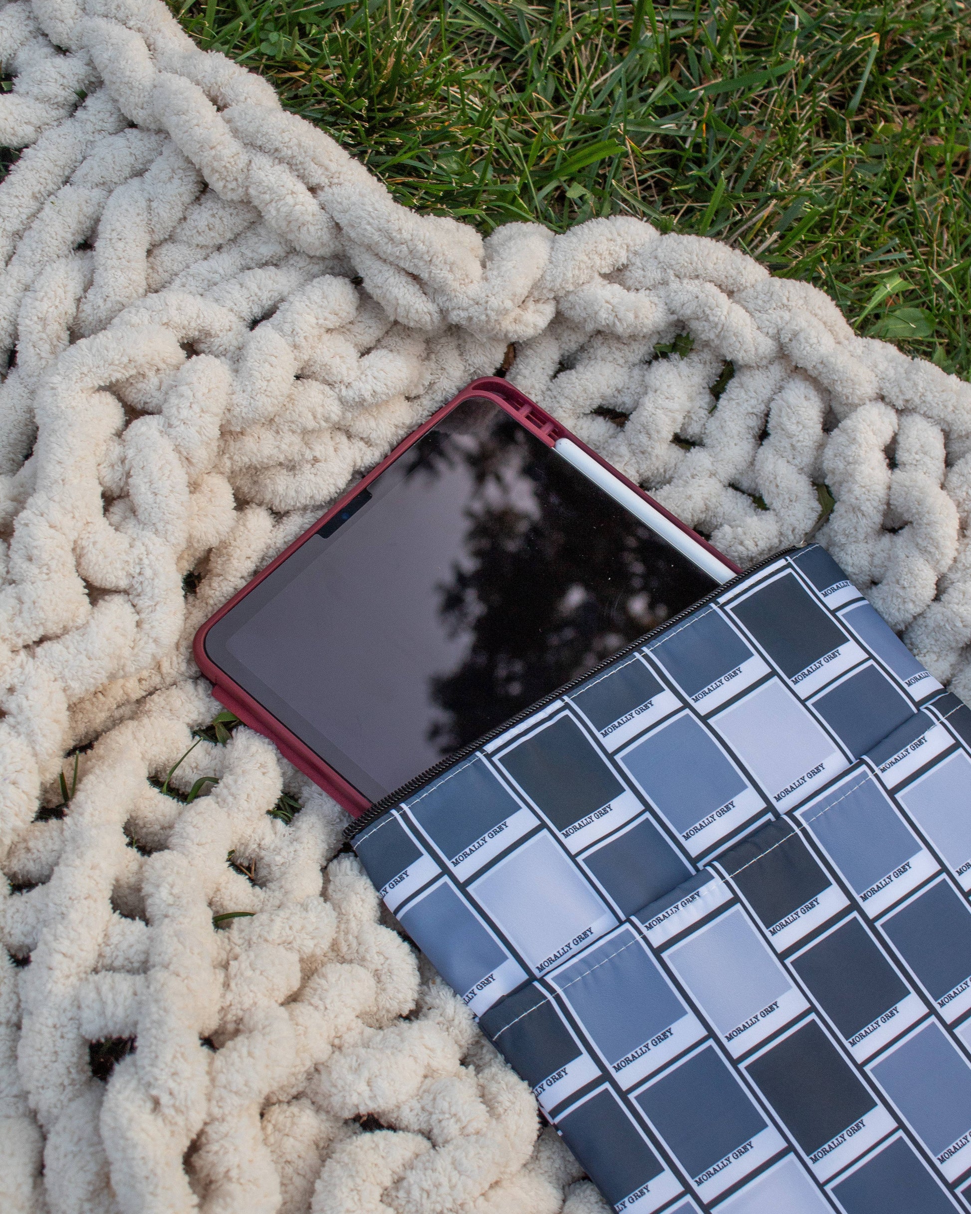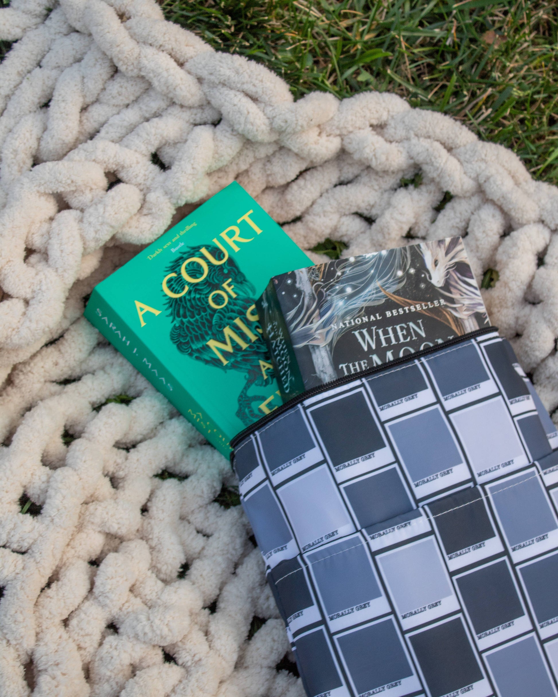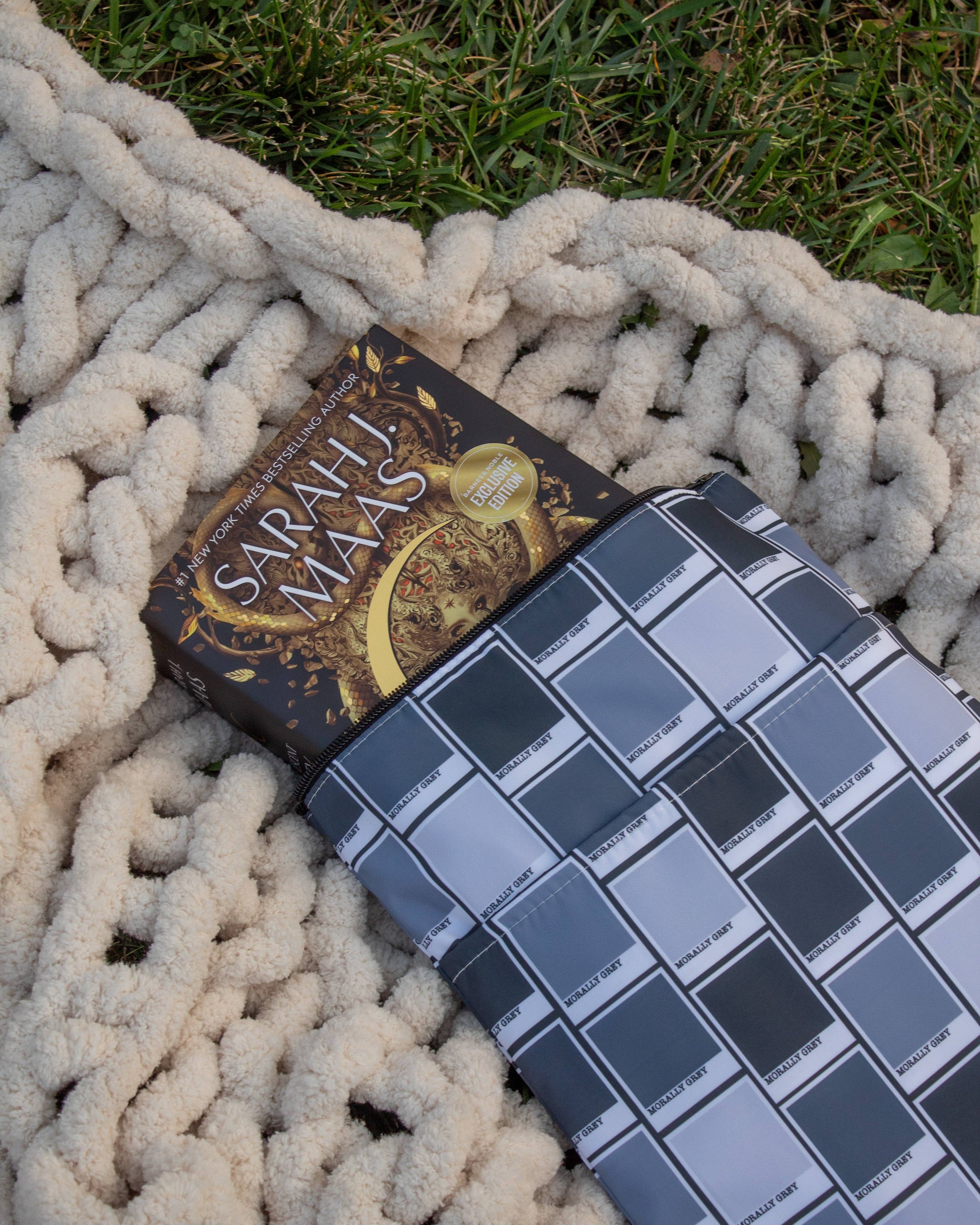 This large water-resistant book / tablet sleeve was designed by a reader for readers. This book sleeve is large enough to hold even the chonkiest of fantasy novels and will keep them safe along your travels. // Details // - 12.5"x9.75" - Water-Resistant (not waterproof, if it is submerged it will seep in through the seems. But you're safe from spills and rain!) - Sturdy silver colored metal zipper - Outside Front Pouch - Main pouch can fit up to hardcover HOFAS, or two paperback novels, and up to an IPad pro 12.9" - Front pouch can fit an IPad Air, a smaller paperback or a kindle. - Lightly padded